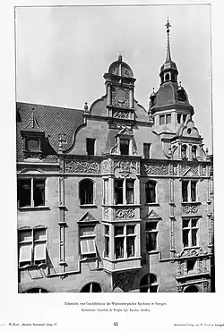 - Wilhelm Kick (Hrsg.): Moderne Neubauten. (Mappenwerk) 4. Jahrgang, Stuttgarter Architektur-Verlag Kick, Stuttgart 1902, Tafel 48. (Teilansicht vom Geschäftshaus der Württembergischen Sparkasse in Stuttgart)