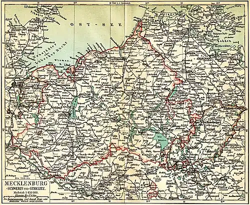 - ↑ Vgl. „Mecklenburg“, in: Meyers Großes Konversations-Lexikon: 20 Bde., Leipzig und Wien: Bibliographisches Institut, 1902–1908, Band 13 'Lyrik – Mitterwurzer' (1906), S. 499–508, hier S. 503.