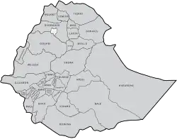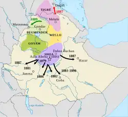 Im 18. Jahrhundert zerfiel das Reich der salomonischen Dynastie in die Herrschaftsbereiche Begemder (mit Gonder), Godscham, Shewa, Wällo und Tigray (Ära der Richter). Ab 1855 gelang es Tewodros II., diese Gebiete wieder zu vereinen. Menelik II. aus Shewa verlegte die Hauptstadt ins 1886 gegründete Addis Abeba und dehnte seine Herrschaft im Südosten über das Emirat Harar (1887) aus, im Süden über die Königreiche der Region Gibe (1885/1902 Gumma, 1886 Gomma, 1891 Limmu-Ennarea, 1894 Janjero; 1884/89 Oberhoheit über Jimma/Abba Jifar mit Garo und Gera) sowie über Wolaytta (1896) und Kaffa (1897). Aus den bestehenden Feudalstrukturen entwickelten sich allmählich Provinzen (amharisch ግዛት gǝzat).[15]