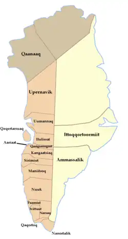 Kommune Qeqertalik | seit 2018 | 6.180 | Distrikt Qasigiannguit (1115) Distrikt Qeqertarsuaq (854) Distrikt Aasiaat (3107) Distrikt Kangaatsiaq (1104) | |