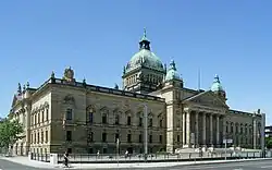 Gemäß § 2 VwGO ist die Verwaltungsgerichtsbarkeit in mehrere Stufen gegliedert. Auf der ersten Stufe stehen die Verwaltungsgerichte, die regelmäßig die erste Instanz für Rechtsstreitigkeiten darstellen.[2] Auf der zweiten Stufe folgen die Oberverwaltungsgerichte, von denen in jedem Bundesland eines existiert. Bei beiden Gerichtstypen handelt es sich um Gerichte der Länder. In einigen Bundesländern werden die Oberverwaltungsgerichte aus historischen Gründen als Verwaltungsgerichtshöfe bezeichnet. Auf der letzten Stufe steht das Bundesverwaltungsgericht (BVerwG) als eines der fünf obersten Gerichtshöfe des Bundes. Es hat seinen Sitz in Leipzig im ehemaligen Gebäude des Reichsgerichts. Gemäß § 5 VwGO bildet das Verwaltungsgericht zur Bearbeitung von Rechtsstreitigkeiten Kammern, die aus drei Berufs- und zwei ehrenamtlichen Richtern bestehen. Streitigkeiten von geringer Komplexität soll eine Kammer gemäß § 6 VwGO einem Einzelrichter zur Entscheidung übertragen. Das Oberverwaltungsgericht besteht gemäß § 9 VwGO aus Senaten, die mit mindestens drei Berufsrichtern besetzt sind, in manchen Ländern zusätzlich mit zwei hauptberuflichen oder ehrenamtlichen Richtern. Auch beim Bundesverwaltungsgericht bestehen Senate. Diese sind gemäß § 10 VwGO mit fünf Berufsrichtern besetzt.