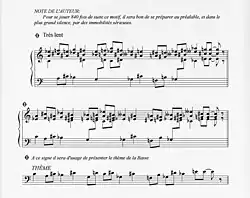 Das Thema des Stücks ist eine einstimmige, einfache Melodie, die nur Viertel- und Achtelnoten enthält. Harmonisch sind in der nur 13 Zählzeiten langen Melodie zahlreiche Sprünge zwischen verschiedenen Tonarten enthalten. Es gibt keine tonale Melodieführung, so gibt es etwa keinen klaren Grundton, auch wenn man die Melodie in vier verschiedene kurze Abschnitte mit eigener Tonart einteilen kann. Taktstriche oder genaue Tempoangaben sind nicht vorhanden, lediglich eine Anweisung Très lent (frz.: sehr langsam). Auch das Musikinstrument ist nicht angegeben, es gilt jedoch als sicher, dass das Stück für Klavier oder Harmonium geschrieben wurde.