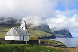 Die jetzige Kirche stammt aus dem Jahr 1892. Das Altarbild ist eine Kopie der Anbetung von Giuseppe Chiari (1654–1727). Das Silber in der Kirche ist ein Geschenk der britischen Regierung, die sich so bei der Bevölkerung für die Rettung der Mannschaft der Brigg Marwood bedankt hat. Das Schiff hatte 1847 auf dem Weg von Afrika nach Liverpool in einem Wintersturm sein Ruder eingebüßt und war nach einer Drift von drei Wochen in der Bucht östlich von Viðareiði gestrandet.