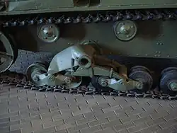 Das Fahrwerk setzte sich aus zwei Paar Schwingarmen pro Seite, bestückt mit jeweils einer Blattfeder, zusammen. An diesen Armen befanden sich nochmals je zwei horizontal bewegliche Schwinghebel, in denen jeweils zwei Laufrollen saßen. Die vorderen Laufrollen besaßen Gummibandagen, im Gegensatz zu den hinteren, die ganz aus Stahl bestanden. Die Antriebsräder waren im vorderen Bereich des Fahrzeugs montiert und die Leiträder dementsprechend am Heck. Die 230 Millimeter breiten Ketten zu je 102 bis 103 Gliedern wurden zusätzlich noch über vier kleine Stützrollen geführt.