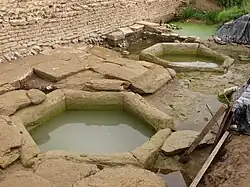Bei der Treppe wurden Fragmente kleinformatiger Weihreliefs gefunden, darunter Darstellungen der Pferdegöttin Epona. In der Verfüllung des westlichen Beckens kam eine Münze (Antoninian) des Kaisers Tacitus (275–276 n. Chr.) zum Vorschein. Organische Funde aus dem Bereich konnten mithilfe der C14-Datierung in das späte 3. Jahrhundert eingeordnet werden. Die Verfüllung der Becken erfolgte wohl nach dem Limesfall, möglicherweise um 277–278 n. Chr., als Kaiser Probus die Germanen hinter den Neckar zurückdrängte.[7]