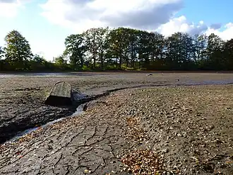 | Viehteich nachdem das Wasser abgelassen wurde und ein altes Boot am Zufluss | ||