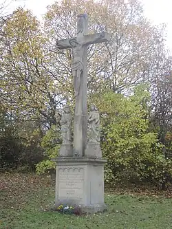 Das etwa 350 cm hohe Kreuz mit unten verstärktem Schaft trägt die lebensgroße Figur des Christus und den Kreuztitel.[1] Die 100 cm hohen Assistenzfiguren stellen Maria und Johannes dar.[1]