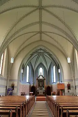 Die Kirche ist ein gewesteter, neugotischer Bau mit eingezogenem Chor und zweifach gestuften Strebepfeilern. Der mit einem Pyramidenhelm bekrönte Turm ist der Ostfassade leicht vorgestellt. Über dem vierjochigem Langhaus erhebt sich ein Kreuzrippengewölbe, über dem Chor mit Polygonalschluss ein Sternrippengewölbe. Die Schablonenmalereien im Chor wurden 1982 restauriert.