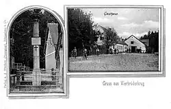 Die ursprünglich als schwarzes Holzkreuz[3] später als Steinstele neu errichtete Säule zeigte im Kapital vier bärtige, behelmte Männerköpfe. An der Säule selbst war wahrscheinlich spätestens seit 1900 das Wappenschild des Deutschen Ordens und eine Tafel mit folgendem Spruch angebracht: