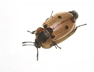 Die Käfer werden 12 bis 14 Millimeter lang und haben einen flachen, ovalen Körper. Sie haben eine gelbbraune Körpergrundfarbe. Auf den Deckflügeln befindet sich je am Halsschild und etwas hinter der Mitte ein schwarzer Fleck. Das Schildchen (Scutellum) ist ebenfalls schwarz. Der Halsschild ist seitlich und zu den Deckflügeln hin gelbbraun gefärbt, in der Mitte, bis zum Vorderrand befindet sich ein ausgedehnter, schwarzer Fleck. Der Kopf, die Fühler und die Beine sind schwarz, die Fühlerkeulen und die Tarsen sind etwas heller gefärbt. Die seltene Form sexmaculata besitzt einen zusätzlichen schwarzen Fleck jeweils am Ende der Deckflügel.