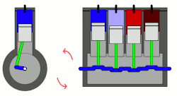 Viertakt-Vierzylinder-Reihenmotoren haben in der Regel einen Hubzapfenversatz von 180° zwischen dem 1. und 2. sowie dem 3. und 4. Zylinder, zwischen den beiden mittleren Zylindern (2 und 3) gibt es keinen Versatz. Dadurch sind die Massekräfte 1. Ordnung ausgeglichen, es treten aber freie Massekräfte 2. und höherer Ordnung auf,[6] die ungünstigerweise auch mit der Zündfrequenz zusammenfallen. Die Massenkräfte 2. Ordnung können mit zwei gegenläufigen, mit doppelter Kurbelwellendrehzahl rotierenden Ausgleichswellen kompensiert werden (Lanchester-Ausgleich). Die beiden Möglichkeiten der Zündreihenfolge (1-3-4-2 oder 1-2-4-3) unterscheiden sich nicht in der Laufruhe.