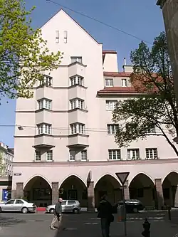- Wohnhausanlage der Gemeinde Wien „Thury-Hof“, Marktgasse 3–7 / Salzgasse 2–4, Wien 9 (1925–1926), mit Karl Hauschka