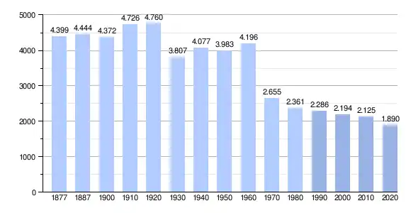 Die kontinuierliche Bevölkerungsrückgang in der zweiten Hälfte des 20. Jahrhunderts ist im Wesentlichen auf die Mechanisierung der Landwirtschaft und den damit einhergehenden Verlust an Arbeitsplätzen zurückzuführen.[4]
