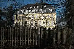 Die palastartige zweigeschossige Anlage auf hohem Kellergeschoss mit Mansardwalmdach, Mittelrisalit, reicher architektonischer Fassadengliederung und Freitreppe wurde im Louis-seize-Stil nach Plänen des Architekten Gustav von Cube (1873–1931) erbaut. Der Architekt war der Schwager des Bauherrn Carl Sternheim.