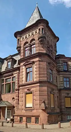 Die Räume gruppierten sich in jedem Stockwerk um ein zentrales Vestibül, dessen oberstes durch eine Dachlaterne beleuchtet wurde. Fußbödendurchbrüche sollten das Licht bis ins Erdgeschoss leiten.[7] Diese „Beleuchtungsanlage“ wurde bereits 1912 beseitigt, als die Vereinsbank das Haus für ihre Zwecke umbaute.[8] Die Privaträume der Familie (Schlafzimmer, Bad, Speise- und ein Kinderspielzimmer) lagen im Erdgeschoss, während der erste Stock ausschließlich von Gesellschaftsräumen belegt ist – eine ungewöhnliche Anordnung, umgekehrt zu der sonst üblichen.[7] Der große Saal wies eine Grundfläche von 120 m² auf, der größte, den es in einem Privathaus in Worms damals gab. Er war in maurischem Stil gestaltet.[9] Das Treppenhaus ist erhalten und weist zwei Wandgemälde mit italienischen Motiven (vermutlich von Mattäus Keuffel) auf.[10]