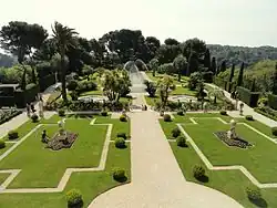 - Der französische Garten französisch Le jardin à la française ist der größte von allen. Er befindet sich im Mittelpunkt der Parkanlage und liegt direkt vor der Villa und ist sichtbar von den Zimmern des Gebäudes. Er ist symmetrisch angelegt und besteht aus einem zentralen Teich und ist von weiteren kleinen Teichen und Plantagen umgeben. Das Teichbecken ist mit Seerosen und Wasserhyazinthen dekoriert und wird von einem Tempel der Liebe sowie von einer Kaskade dominiert. In der Mitte befindet sich ein Springbrunnen, der alle zwanzig Minuten neu gestartet wird und mit dem Erklingen klassischer Musik untermalt wird. Neben der Villa befindet sich eine Terrasse mit einem formellen Garten und französischen Formschnitten. Neben der Terrasse befindet sich ein Park mit Palmen und einem langen Becken mit Springbrunnen, Statuen und Becken mit Seerosen und andere Wasserpflanzen geschmückt. Am anderen Ende des Parks befindet sich ein Hügel, der mit Zypressen bedeckt ist. Rund um den Garten steht eine Replik des Tempels der Liebe des Grand-Trianon-Palasts. Der Hang unterhalb des Tempels hat eine Wasser-Kaskade in Form einer Treppe, die das darunter liegende große Becken mit Wasser speist. Aus dem französischen Garten führt zu einer weiteren unteren Ebene eine Treppe.