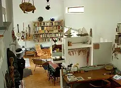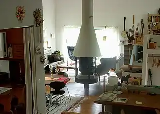 Der Grundriss ist luftig und offen gehalten. Vom Eingangsbereich aus verschafft man sich leicht einen Überblick über das ganze Haus. Die unterschiedlichen Raumfunktionen sind nach dem Prinzip „Raum-im-Raum“ im über vier Meter hohen Volumen angeordnet. Über Halbtreppen und Absätze erreicht man die verschiedenen Wohnbereiche. Das Wohnzimmer mit seinen großen Fenstern nach Süden und Südwesten wird von einem runden offenen Kamin dominiert, der mitten im Raum angeordnet wurde. Schmale Fensterschlitze geben interessante Lichteffekte. Der kleine Schreibplatz des Hausherrn oder der Hausfrau liegt etwas erhöht direkt beim Eingang, mit Aussicht über das ganze Innere des Hauses, und ähnelt so der Kommandobrücke eines Schiffes. Auf demselben Niveau befindet sich die Küche, eine kurze Treppe führt nach oben zu den Kinderzimmern. Auf der Zwischendecke über der Küche befand sich anfangs noch ein Spielplatz für die drei Kinder des Paares. Das Elternschlafzimmer mit Bad liegt, etwas privater, unter den Kinderzimmern. Alles erscheint bis ins kleinste Detail durchdacht und ausgeführt.