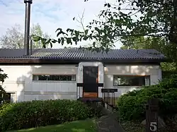 Die Villa besteht aus drei Hausteilen, die sich um einen atriumartigen Innenhof mit Obstbäumen, Spiegeldamm und Sitzplätzen gruppieren. Der Wohnteil liegt nach Osten hin, nach Norden schützt eine überdachte Veranda vor Einsicht in den Garten. Garage und Atelier im Südwesten respektive Westen bilden den Abschluss. Das Haus ist strikt im brutalistischen Architekturstil entworfen, die asymmetrische Fensterplatzierung lässt den Einfluss Le Corbusiers ahnen. Die Außenwände bestehen aus stehenden und liegenden Gasbetonelementen, die mit einer Harke ein charakteristisches Rillenmuster erhalten hatten. Die Fassaden gehen in einer weichen Kurve ins gewölbte Dach über, auch das aus Gasbetonelementen. Über dem Dach „schwebt“ gleichsam ein weiteres Dach, ein Satteldach, eingedeckt mit schwarzem Wellblech, das den eigentlichen Regenschutz ausmacht. Das war eine für Schwedens Klima gewagte Konstruktion, die auch nicht immer zufriedenstellend funktionierte.