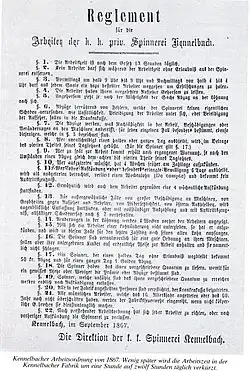Im Jahr 1838 hatten die Familien Schindler und Jenny die Baumwollspinnerei in Kennelbach, wo sie die Wasserkraft der Bregenzer Ach nutzen konnten, in Betrieb genommen. Die Fabrik bot zwar neue Verdienstmöglichkeiten für die verarmte Bevölkerung, allerdings kam es zu einer völligen Abhängigkeit der Arbeiter vom Unternehmer. In den 1860er Jahren waren 13 Arbeitsstunden pro Tag in der Kennelbacher kk. Baumwollspinnerei die Regel. Da die gesetzlichen Bestimmungen fehlten, arbeiteten auch neun- und zehnjährige Kinder in den Vorarlberger Textilfabriken. Die Löhne der Arbeiter waren schlecht.