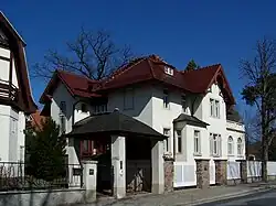 Die zweigeschossige, mit Villengarten und Einfriedung unter Denkmalschutz[1] stehende Villa hat einen „malerisch-unregelmäßigen Fassadenaufriss“[2] und obenauf ein Walmdach mit Formziegeln auf dem First und den Dachgraten.