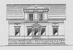 In der traufständigen, vierachsigen Straßenansicht zur Käthe-Kollwitz-Straße steht ein zweigeschossiger und zweiachsiger Mittelrisalit mit Walmdach; vor diesem befindet sich eine offene Veranda mit Freitreppe. Der (gegenüber der Bauzeichnung) vereinfachte Putzbau zeigt nur sparsame Gliederungen. Die Fenster werden durch Sandsteinrahmen mit Sohlbänken und Verdachungen eingefasst.
