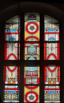 Das Rundbogenfenster ist mit farbigen Ornamenten gestaltet, eine Darstellung symbolisiert bspw. einen Orgelprospekt. Das Fenster aus der Standesamts-Zeit des Hauses wurde aufgefrischt.