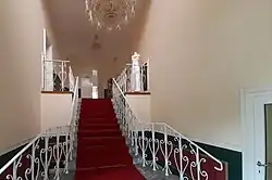 Eine mit einem roten Teppich belegte Marmortreppe im Inneren führt in die oberen Räumlichkeiten, die den Roten Salon, den Blauen Salon und den Grünen Salon umfassen. Die Treppe wird flankiert von einem schmiedeeisernen Geländer. Darüber sind Kristall-Kronleuchter positioniert. Auch in den anderen Räumen hängen Kristallleuchter.