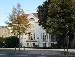 Der fünfachsige Putzbau ist zweigeschossig mit Souterrain und Walmdach. Auf der Schauseite zur Puschkinallee sind die hochrechteckigen Fenster und Fenstertüren teilweise mit Fensterläden ausgestattet. Den Mittelrisalit bekrönt ein spitzer Dreiecksgiebel mit Halbrundfenster. Dem Risalit ist ein Freisitz vorgelagert und die Fenster sowie Fenstertüren sind als Drillingsfenster ausgebildet. Ein Relief zeigt spielende und musizierende Putten. Ein Mäanderband umläuft das Gebäude unterhalb der Dachtraufe.