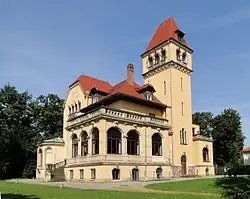 Die vom Stil der Neorenaissance inspirierte zweigeschossige Villa hat gartenseitig einen rechteckigen, das Gebäude überragenden Turm. Verwinkelte Fassadenansichten, Balustraden, Balkone und reichlich plastischer Fassadenschmuck aus Sandstein und die für den Architekten üblichen Fensterbänder aus zwei, drei oder vier Fenstern dokumentieren den Reichtum seines Bauherren. Geputzte Fassaden mit Sandsteingliederungen, elegant geschweiften Giebeln und Freitreppen sowie Wintergarten und Sommerveranda ergänzen den Bau. Der um 1909 erfolgte Umbau vergrößerte die Ausstellungsräume und fügt sich harmonisch in die vorhandene Bausubstanz.