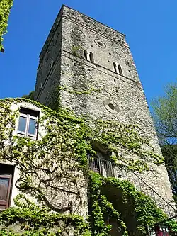 Den Eingangsbereich der Villa am zentralen Kathedralen-Vorplatz bildet ein massiver Torturm. Diesen betritt man durch ein spitzbogiges Tor, das von zwei steinernen Krokodilköpfen geschmückt wird.[2] Im Inneren wird der etagenlose Turm durch ein Rippengewölbe und zahlreiche Elemente aus gelbem und grauem Tuffgestein gestaltet. In den Ecken des Turmes stehen vier Statuen, welche die 4 Jahreszeiten darstellen. Der Turm diente schon immer als Schmuckelement und blieb ohne Verteidigungsfunktion. Die trifft auch auf den 30 Meter hohen Turm im inneren des Komplexes, den Torre Maggiore, zu. Betreten kann man den dreietagigen Turm durch ein Spitzbogen-Portal. Im Obergeschoss ist er mit zwei Doppelfenstern auf jeder Seite verziert.