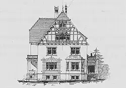 Die zweigeschossige, mit der Einfriedung unter Denkmalschutz stehende[2] Villa über L-förmigem Grundriss, auch als Mietvilla angesprochen, hat eine „malerische Aufrissbildung“[3] im Stil der deutschen Architektur um 1500 (Altdeutscher Stil, Neorenaissance). Das Gebäude steht auf einem Souterraingeschoss, das ziegelgedeckte Krüppelwalmdach ist ausgebaut. First und Grate sind mit Zierziegeln gedeckt.