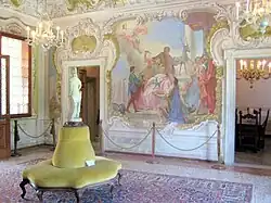 Die Villa wirkt trotz des quadratischen Grundrisses durch die aufgesetzten Dachzimmer und die französischen Fenster mit Balkongittern leicht und zierlich. Von der Vorhalle erreicht man den großen Salon mit einer umlaufenden Galerie, der von Giuseppe Angeli, einem Schüler von Giambattista Piazzetta und Mitarbeiter von Giovanni Battista Tiepolo, um 1750 ausgemalt wurde. An den Wänden schuf er die Opferung Iphigenies und den Raub der Helena und als Deckengemälde die Apotheose der Familie Widmann.