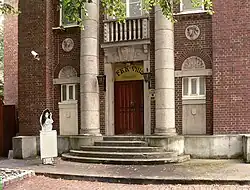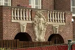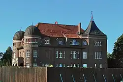 Es ist ein zweigeschossiger Backsteinbau mit Steingussdekor als Fassadenschmuck. Ein Risalit mit flankierenden Halbsäulen in Kolossalordnung bildet den monumentalen Haupteingang zur Straßenseite. Auf der Südseite sind an den Ecken zwei Rundtürme mit Kuppeldach in das Gebäude integriert. Zwischen den Türmen befindet sich ein Vorbau in der Art eines Altans mit einem Balkon. Er ist durch zwei Bögen geöffnet, in deren Mitte eine Skulptur des Merkur angebracht ist.
