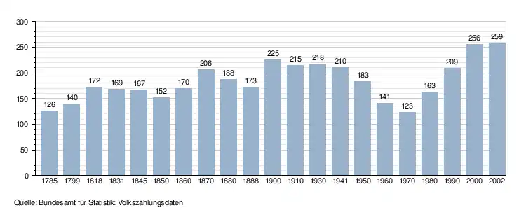 - ↑ Daten der Eidgenössischen Volkszählungen ab 1850 nach Gemeinden. (XLSX; 10 MB) Bundesamt für Statistik, Neuchâtel, 12. Juli 2024, abgerufen am 24. Juni 2025 (Öffnung in Excel nur über "Anhang/Excel-Datensatz" möglich).