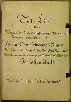 - ↑ N B.R. von Sinner 4, Teilungslibell Vinzenz Sinner, 1749 im Archivkatalog des Staatsarchivs Bern.