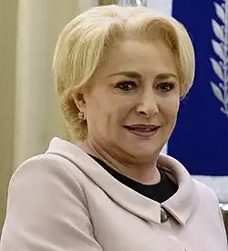 Vasilica Viorica Dăncilă (* 16. Dezember 1963 in Roșiorii de Vede) ist eine rumänische Politikerin der PSD. Sie war vom 29. Januar 2018 bis zum 4. November 2019 Ministerpräsidentin Rumäniens. Rumäniens Regierung wurde am 10. Oktober durch ein Misstrauensvotum vom rumänischen Parlament abgewählt.[1] Sie blieb im Amt bis zur Einsetzung der neuen Regierung von Ludovic Orban.