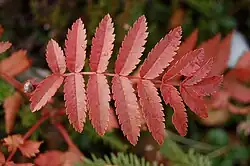 Die wechselständig an den Zweigen angeordneten Laubblätter[4][8] sind in Blattstiel und -spreite gegliedert und sind dabei bis etwa 17–20 cm lang sowie 8 bis 11 cm breit. Der 3–5 Zentimeter lange Blattstiel und die rinnige Rhachis sind mehr oder weniger rötlich. Die unpaarig gefiederte Blattspreite setzt sich gewöhnlich aus 9 bis 19 schmal-eiförmigen bis länglichen oder elliptischen, unterseits helleren Blättchen zusammen.[9][10] Die 4 bis 6 cm langen und etwa 2 cm breiten Blättchen sind fast sitzend, nur das Endblättchen ist mehr oder weniger gestielt. Sie sind nach vorne spitz und zum Grund hin meist asymmetrisch abgerundet, seltener spitz. Der einfach bis doppelt gesägte Blattrand bildet eine spitze, ungleiche Zähnung aus.[9] Die unbehaarte Blattoberseite zeigt eine sommergrüne Färbung, wohingegen die Unterseite eher graugrün gefärbt ist und eine leichte Behaarung entwickeln kann.[11] Die Fiederblättchen der Eberesche besitzen keine Blattzahndrüsen an der Spitze.[11][12]