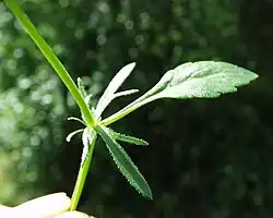 Die Laubblätter sind wechselständig am Stängel verteilt. Die Blattspreite der unteren Laubblätter ist eiförmig-herzförmig, weiter oben werden sie mehr elliptisch-lanzettlich. Die blattartigen Nebenblätter sind nur wenig verbreitert, mit vier bis sechs seitlichen Abschnitten und mit einem mehr oder weniger linealischen, immer ganzrandigen Endabschnitt.