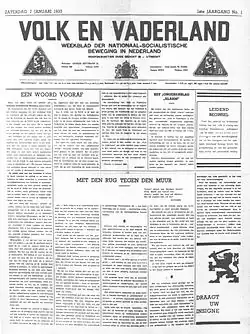 Die Erstausgabe von Volk en Vaderland erschien am 7. Januar 1933 mit George Kettmann als erstem Chefredakteur. Zu diesem Zeitpunkt bestand die NSB erst seit einem Jahr und war noch völlig unbedeutend. Mit der Gründung des Nationale Dagblad trat bald auch in der NSB-Presse die Spaltung der Partei in einen völkisch-annexionstischen Flügel, der für einen Anschluss an Deutschland eintrat, und einen anderen Flügel, der auf eigenständige Niederlande bestand, zutage. Der letztere und größere Flügel wurde unter anderem von Parteichef Anton Mussert vertreten und fand sich in Volk und Vaderland wieder, während ersterer vom späteren Fraktionschef der NSB, Meinoud Rost van Tonningen, vertreten wurde und dessen Ansichten im Nationale Dagblad zur Schau stellen ließ.[1] Im Gegensatz zum Nationale Dagblad war Volk en Vaderland bereits vor dem Zweiten Weltkrieg ein Erfolg, 1935 wurde eine Auflage von 80.000 Exemplaren erreicht.[2]