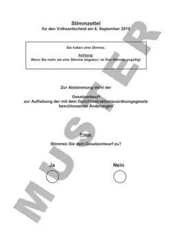 Probleme bereitete auch die Formulierung des Stimmzettels. Der Richterbund beanstandete, dass die Abstimmungsfrage irreführend sei, da Gegner der Reform mit „Ja“ stimmen mussten.[51] Der Grund dafür ist, dass beim Volksentscheid die Frage nach der Aufhebung der Reform gestellt wurde. Nein-Stimmen stellten somit keine Ablehnung, sondern eine Zustimmung zur Gerichtsstrukturreform dar. Dass dies zu Verwirrungen führen kann, räumte auch die Landeswahlleiterin ein.[52] Sie veröffentlichte deshalb zur Klarstellung eine Erläuterung zum Stimmzettel.[53]