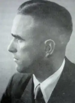 - Der Leiter der VoMi Werner Lorenz ernannte Schmidt am 27. September 1940 in Brașov[15] zum „Volksgruppenführer“.[16][Anmerkung 1] Die NSDAP der Deutschen Volksgruppe in Rumänien (NSDAP der DViR) war am 20. November 1940 auf Druck des Deutschen Reiches per Dekretgesetz Nr. 830 von der faschistischen Regierung Rumäniens unter Ion Antonescu als juristische Person öffentlichen Rechtes anerkannt und zum „alleinigen Willensträger der Deutschen Volksgruppe in Rumänien“ bestimmt. Sie arbeitete im Rahmen des nationalen rumänischen Legionärstaates.[17] Die einigermaßen selbständige Politik seiner Vorgänger wandelte sich nun in eine radikale Militarisierung aller Lebensbereiche der deutschen Minderheit.[18] Dabei erwies sich Schmidt als reiner Karrierist und war bereit jegliche Befehle der übergeordneten Stellen im Deutschen Reich auszuführen, auch wenn diese mit Risiken und Nachteilen für die deutsche Minderheit verbunden waren.[16] Obwohl Schmidt sich mehr mit dem Deutschen Reich und der SS identifizierte als alle anderen „Volksgruppenführer“ Südosteuropas trat er doch erst Anfang 1945 förmlich als SS-Hauptsturmführer bei.[19] Schmidt wurde 1945 verhaftet und verstarb im Frühjahr 1948 in sowjetischer Kriegsgefangenschaft unter ungeklärten Umständen im Lager „1 Kapitalnaia“ in Workuta, Republik Komi.[20][Anmerkung 2]