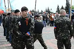 Volksmiliz (russisch народная милиция narodnaja milizija, russisch народное ополчение narodnoje opoltschenije; auch als „Volkswehr“ übersetzt) ist die Eigenbezeichnung paramilitärischer Truppen in der Ostukraine. Sie wurden gleichzeitig und ausgehend von russischen Agitatoren in verschiedenen Städten aktiv, nachdem sich Präsident Wiktor Janukowytsch aus der Hauptstadt abgesetzt hatte. Seit dem April 2014 kämpfen sie für die nicht anerkannten Volksrepubliken Donezk und Lugansk und damit gegen ukrainische Regierungseinheiten im russischen Krieg in der Ukraine. Mit dem Neunten Sanktionspaket[3] wurden Vermögenssperren und EU-Einreiseverbote gegen mehrere Anführer verhängt.