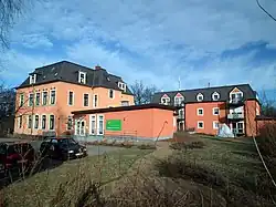 Das Gebäude, dessen Denkmalschutzstatus[1] nach 2008 aufgehoben wurde,[2] ist ein zweigeschossiges Haus auf einem Bruchsteinsockel und mit einem ausgebauten, schiefergedeckten Plattformdachgeschoss. Die Dachgauben werden durch Voluten geschmückt. Das Gebäude steht etwas erhöht zur Straße, was durch eine rechts am Haus vorbeiführende Auffahrtsrampe ausgeglichen wird.