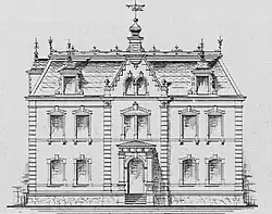In der symmetrischen Straßenansicht steht ein Mittelrisalit, davor der ehemalige Eingangsvorbau mit Rundbogenportal, das heute durch ein Fenster zugesetzt ist. Der Risalit wird vor dem Dach durch einen symmetrischen Trapezgiebel abgeschlossen, auf dem sich ehemals ein Zwiebeltürmchen mit einer Wetterfahne befand.