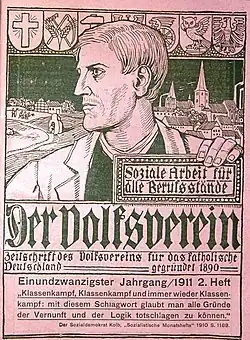 Der Volksverein für das katholische Deutschland wurde am 24. Oktober 1890 von dem Mönchengladbacher Unternehmer Franz Brandts und dem katholischen Geistlichen Franz Hitze unter maßgeblicher Beteiligung der Zentrumspolitiker Ludwig Windthorst und Franz von Ballestrem gegründet und beruhte auf christlich-sozialen Ideen.[1] Nach ursprünglicher Gründung in Köln beschlossen die Gründungsmitglieder, die Zentralstelle des Volksvereins nach Mönchengladbach, dem Wohnort des ersten Vorsitzenden Franz Brandts, zu verlegen. Bedeutende Politiker wie Helene Weber wurden durch den Volksverein wesentlich beeinflusst und engagierten sich darin.
