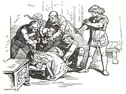 Stefan Neuhaus zufolge steht der Ritter ersatzweise für einen Bürger, eine Konzeption, die seit Lessing gebräuchlich sei. Die (mittelalterliche) peinliche Strafe wird als gelungene Kur und Restitution männlich codierter, bürgerlicher Ordnung hingestellt. Die Kleidung der Delinquentin zu lüften, wäre ein Sittenverstoß, die Verletzung erfolgt daher durch sie hindurch. Das Märchenhafte ist stark reduziert, überhöht aber den jungen Ritter zum Repräsentant einer wunderbaren Ordnung.[3] Vgl. etwa des Strickers Die eingemauerte Frau.