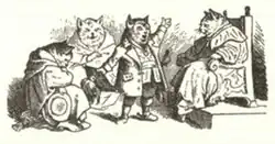 Die Fabel stammt aus Antonius von Pforrs Das Buch der Beispiele der alten Weisen.[1] Erzähler ist Fischadler Holgott aus Nr. 75 Vogel Holgott und Vogel Mosam und Nr. 76 Von zwei Affen. Es folgt noch Nr. 78 Die Katze und die Maus.