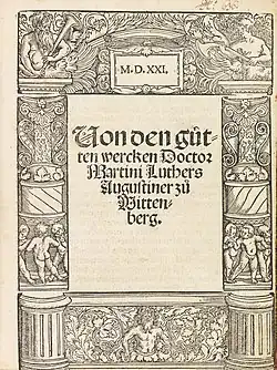 Anfang Juni 1520 erschien Von den guten Werken bei Melchior Lotter in Wittenberg und wurde unverzüglich in Augsburg, Nürnberg, Hagenau, Basel und Halberstadt nachgedruckt. Schon 1521 erschien unter dem Titel De bonis operibus liber eine lateinische Übersetzung (gedruckt durch Johann Gronenberg, mit Vorrede Melanchthons), die ebenfalls vielfach nachgedruckt wurde.[3] Übersetzungen in andere Sprachen mitgerechnet, erlebte die Schrift bis in die 1530er Jahre 23 Neudrucke.[4]