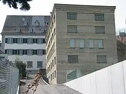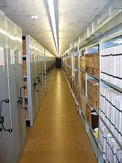 1931 beschloss der Landtag, ein Magazingebäude anbauen zu lassen.[11] Es wurde vom Bregenzer Architekten Willibald Braun geplant und als Schüttbetonbau ausgeführt. 1933 wurde der für viele Jahre modernste Archivbau Österreichs bezogen. Er steht heute, wie das Hauptgebäude, unter Denkmalschutz. Als 1940 die Landeshauptmannschaft Vorarlberg aufgelöst und mit der Landeshauptmannschaft Tirol in Innsbruck zusammengeführt und zur Behörde des Reichsstatthalters in Tirol und Vorarlberg umgebaut wurde, blieb das Vorarlberger Landesarchiv als Zweigstelle Bregenz des Reichsgauarchivs Tirol und Vorarlberg (zuvor Tiroler Landesregierungsarchiv und Tiroler Landesarchiv) in Innsbruck bestehen.[12] Mit dem Ende der NS-Herrschaft begann im Mai 1945 der Wiederaufbau der Vorarlberger Landesverwaltung. Das Landesarchiv wurde wieder zu einer dem Amt der Vorarlberger Landesregierung nachgeordneten Dienststelle.