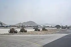 Nach der Einnahme von Kabul durch die Taliban hatten sich tausende Afghanen in der Hoffnung auf eine Möglichkeit zur Flucht am Hamid-Karsai-Flughafen versammelt.[33] Dieser war vor dem Start der Evakuierung, während des Krieges von Soldaten der türkischen Streitkräfte gesichert worden.[34][35] Während des Heranrückens der Taliban an die Hauptstadt Kabul entsandte das Pentagon Mitte August 3.500 Soldaten der US-Streitkräfte nach Kabul, um den Abzug ihres diplomatischen Personals zu sichern, Großbritannien wollte 600 Soldaten der United Kingdom Special Forces nach Kabul schicken, um die Ausreise britischer Staatsbürger und früherer afghanischer Ortskräfte zu unterstützen.[36] Die Zahl der US-Soldaten am Flughafen Kabul wurde am 18. August auf 4.500 erhöht[37] und steigerte sich bis zum 22. August nochmals um 700.[38] Den Angaben zufolge sollen die Soldaten, darunter mindestens 1.000 der 82. Airborne Division, vorübergehend die Reduzierung des US-Botschaftspersonals in Kabul unterstützen.[39][40] Von Kabul flogen die Flugzeuge der US-Streitkräfte hauptsächlich nach Doha und Dubai.[41] Die Bundeswehr errichtete ihre Luftbrücke zwischen Kabul und Taschkent, von wo aus die Evakuierten nach Deutschland weitergeflogen wurden.[38] Aus Deutschland wurden etwa 600 Soldaten, hauptsächlich Fallschirmjäger der Division Schnelle Kräfte, darunter das Kommando Spezialkräfte, für die Evakuierungsmission beordert sowie sechs Airbus A400M eingesetzt.[42][43][44] Großbritannien,[45] Frankreich,[45] Kanada,[46] Niederlande[46], Spanien,[47] Australien,[48] Neuseeland,[49] Indien,[50] Dänemark,[35] Belgien,[51] Polen,[52] Norwegen[53] Tschechien, Italien, Indonesien,[54] Ungarn,[55] Südkorea,[56] Schweden[57] Singapur[58] Russland,[59] und die Türkei[60] evakuierten mit eigenen Militärflugzeugen.[61][38] Außerdem wurde Militärpersonal weiterer Länder am Kabuler Flughafen eingesetzt, bspw. aus Litauen.[62]